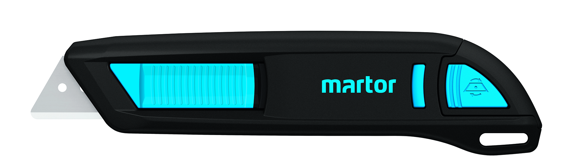 The SECUNORM 300 is supplied as standard with a rounded or pointed trapezoid steel blade. Optionally, a trapezoid blade made of ceramic can be used. The almost 2 cm cutting depth is ideal for opening and cutting cardboard up to 3-ply, sacks, plastic strapping band, film, textiles, etc. And as soon as the cut is finished, the automatic blade retraction protects the user from injury. MARTOR's new product is rounded off with simple yet very safe blade changing.