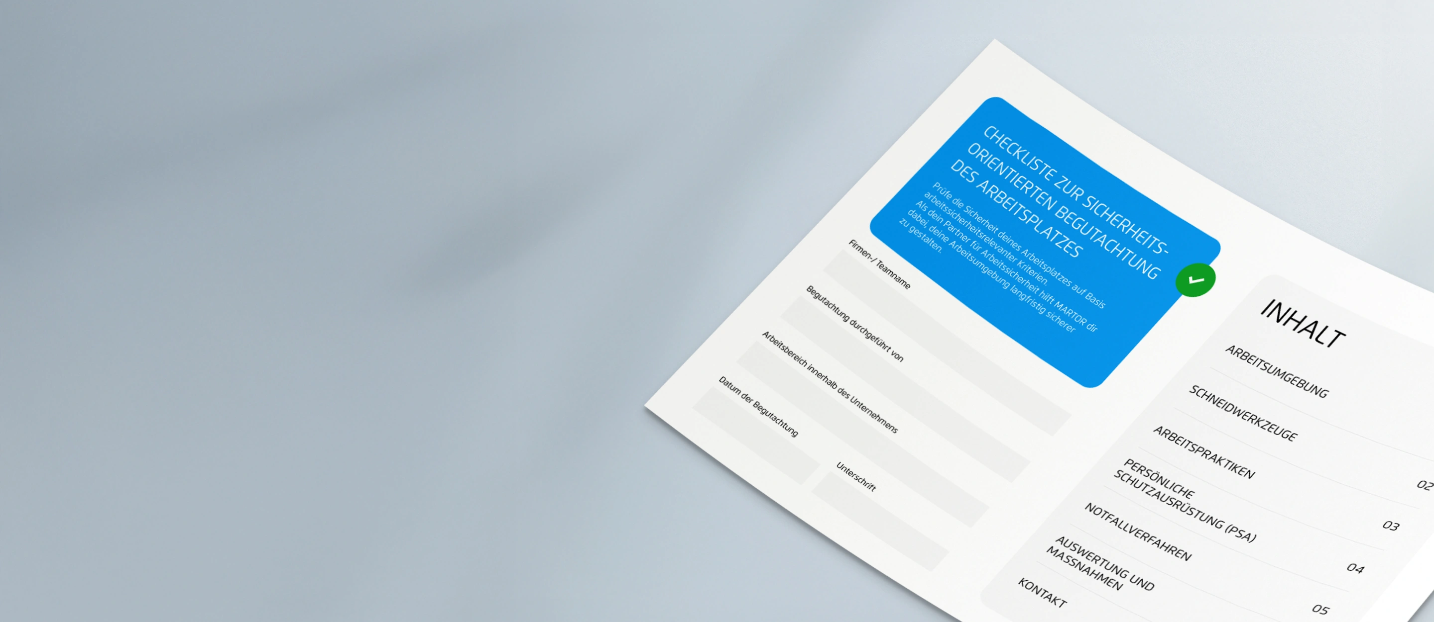 Safety in the workplace begins with proper monitoring: our checklist helps you thoroughly inspect your workplace based on key occupational safety criteria. This allows you to identify risks early on and take targeted measures – for greater protection and peace of mind in every task.